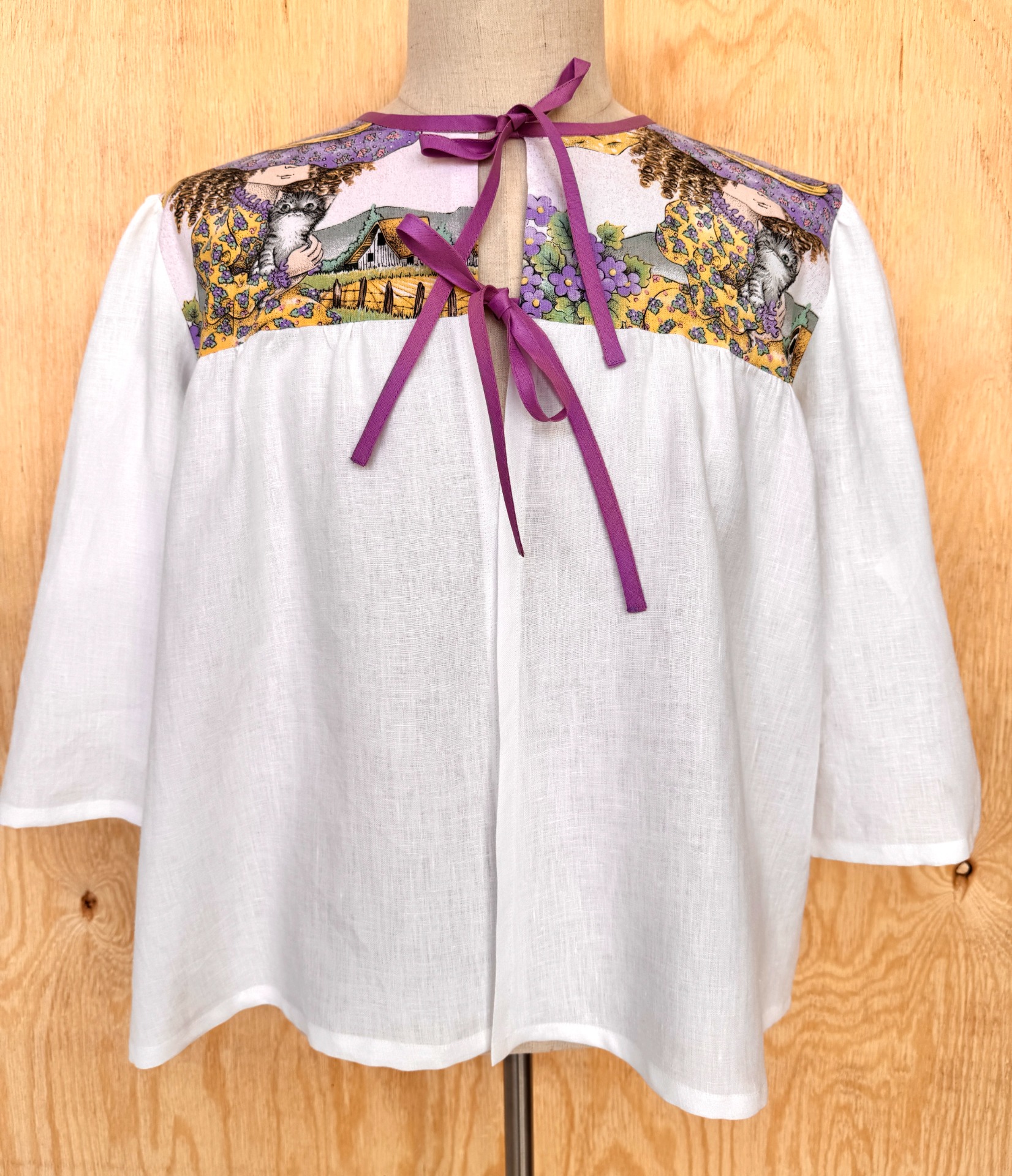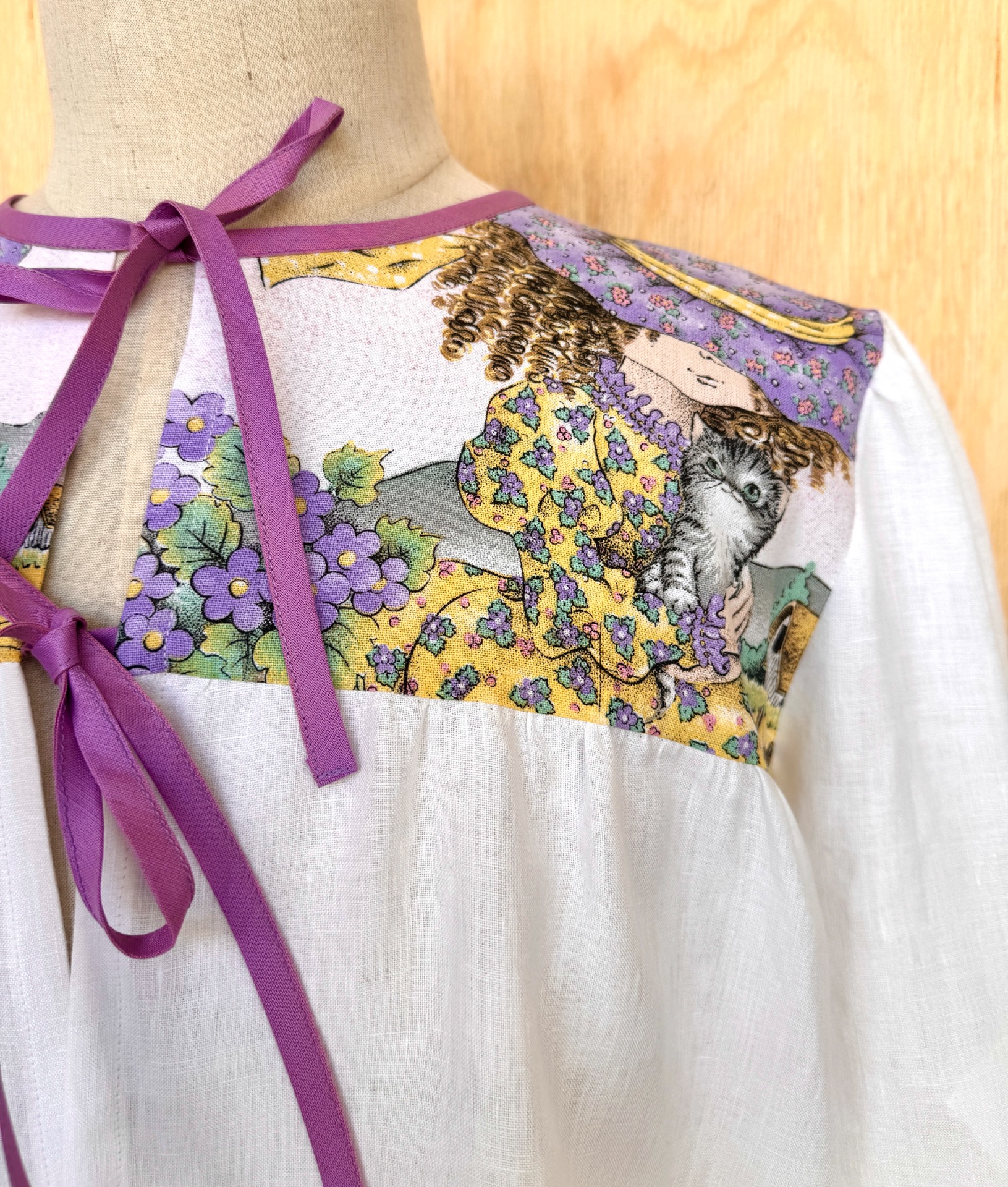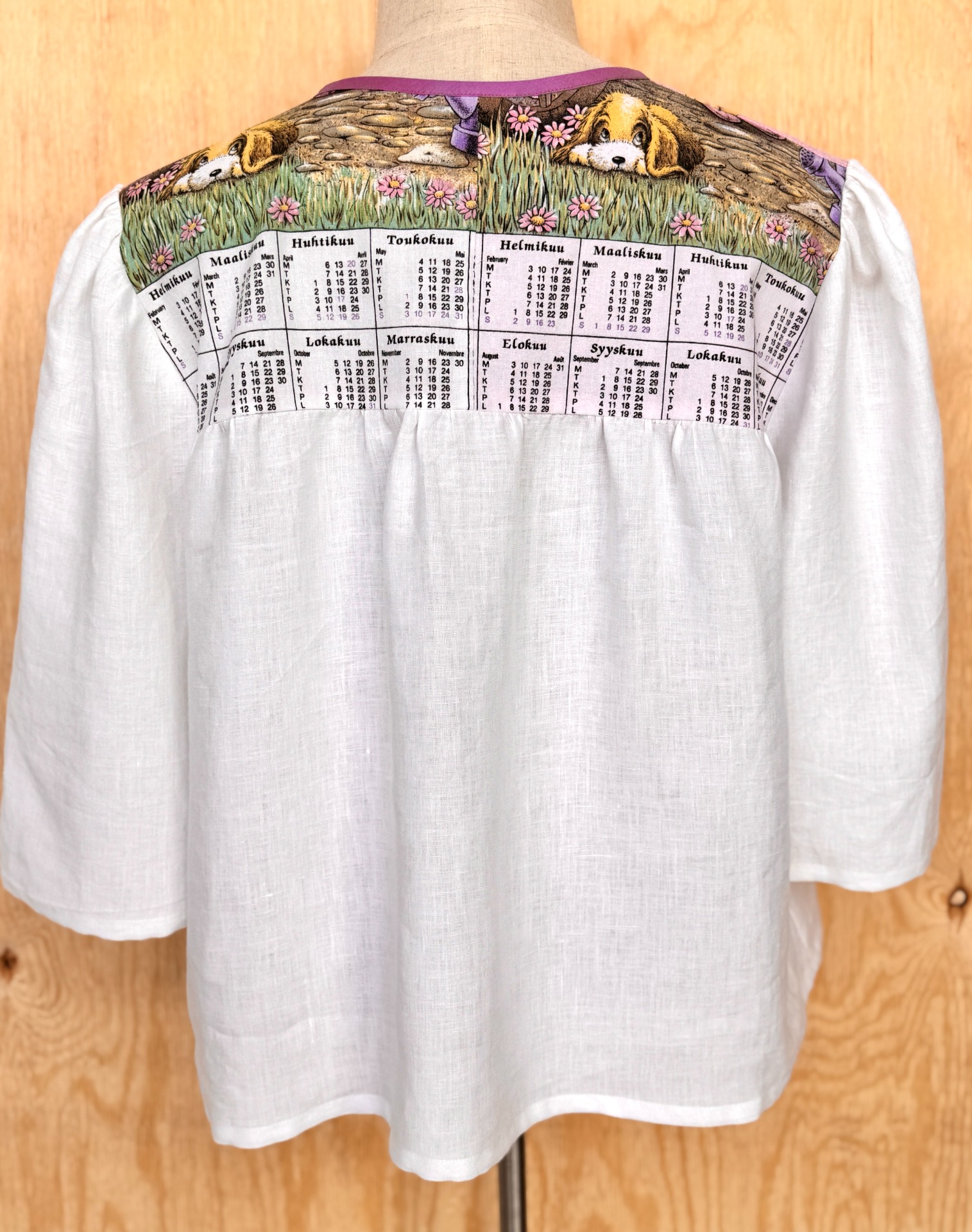 Väljä Neito pusero on valmistettu pellavaisesta käyttämättömästä keittiöpyyheliinasta sekä ylijäämä pellavakankaasta. Leikkaus rinnan yläpuolella. Väljä, rypytetty helma. Vajaamittainen leveä hiha. Hihan pituus 46 cm. Edessä nauhakiinnitys.