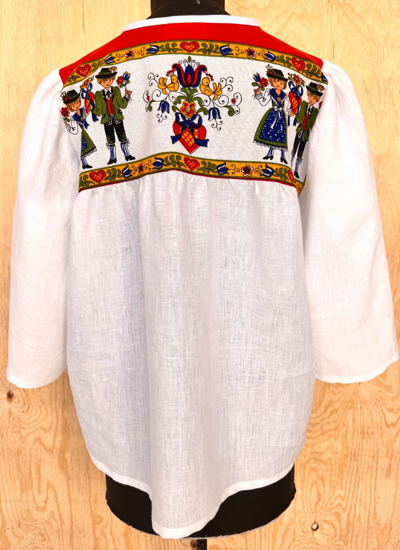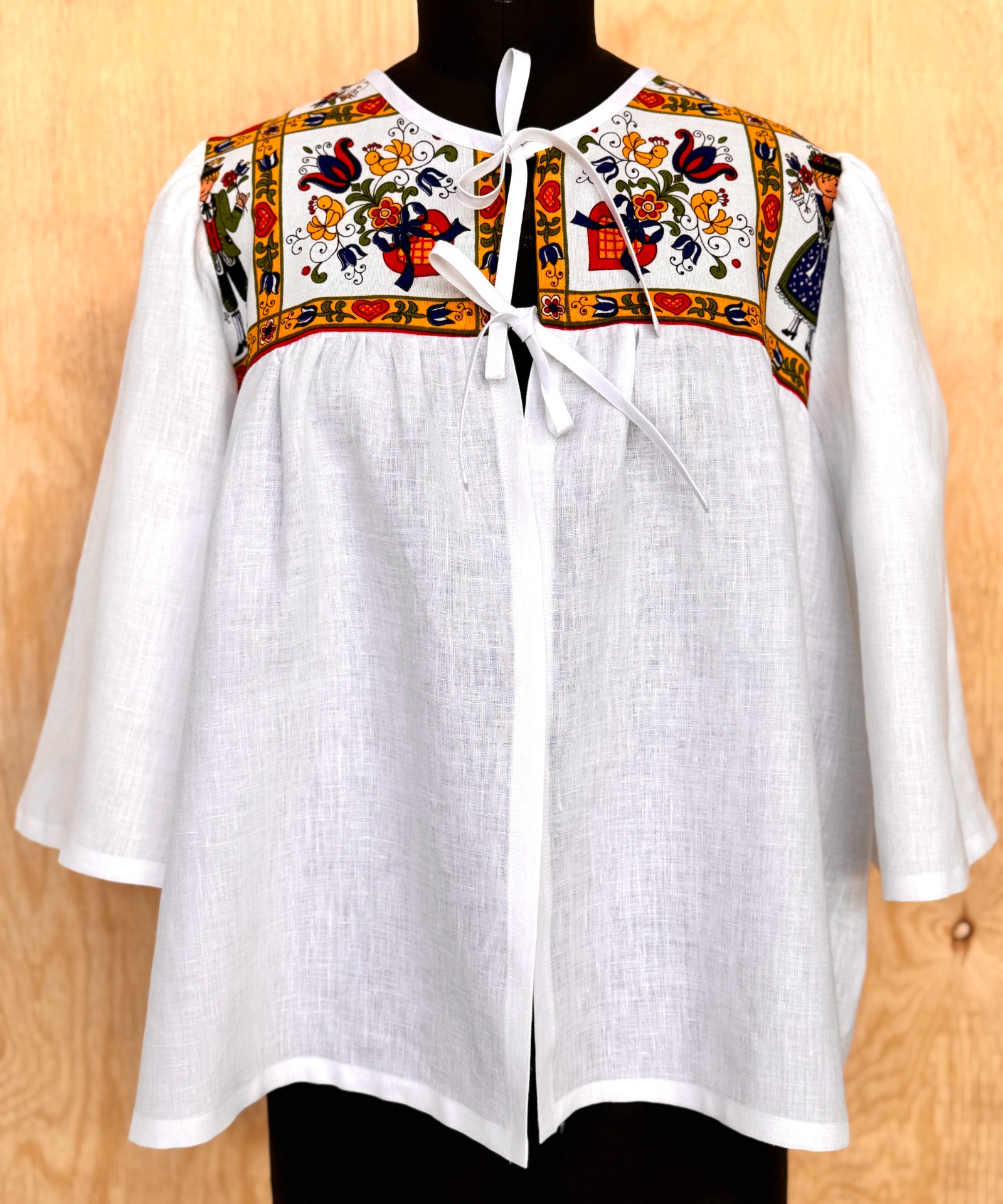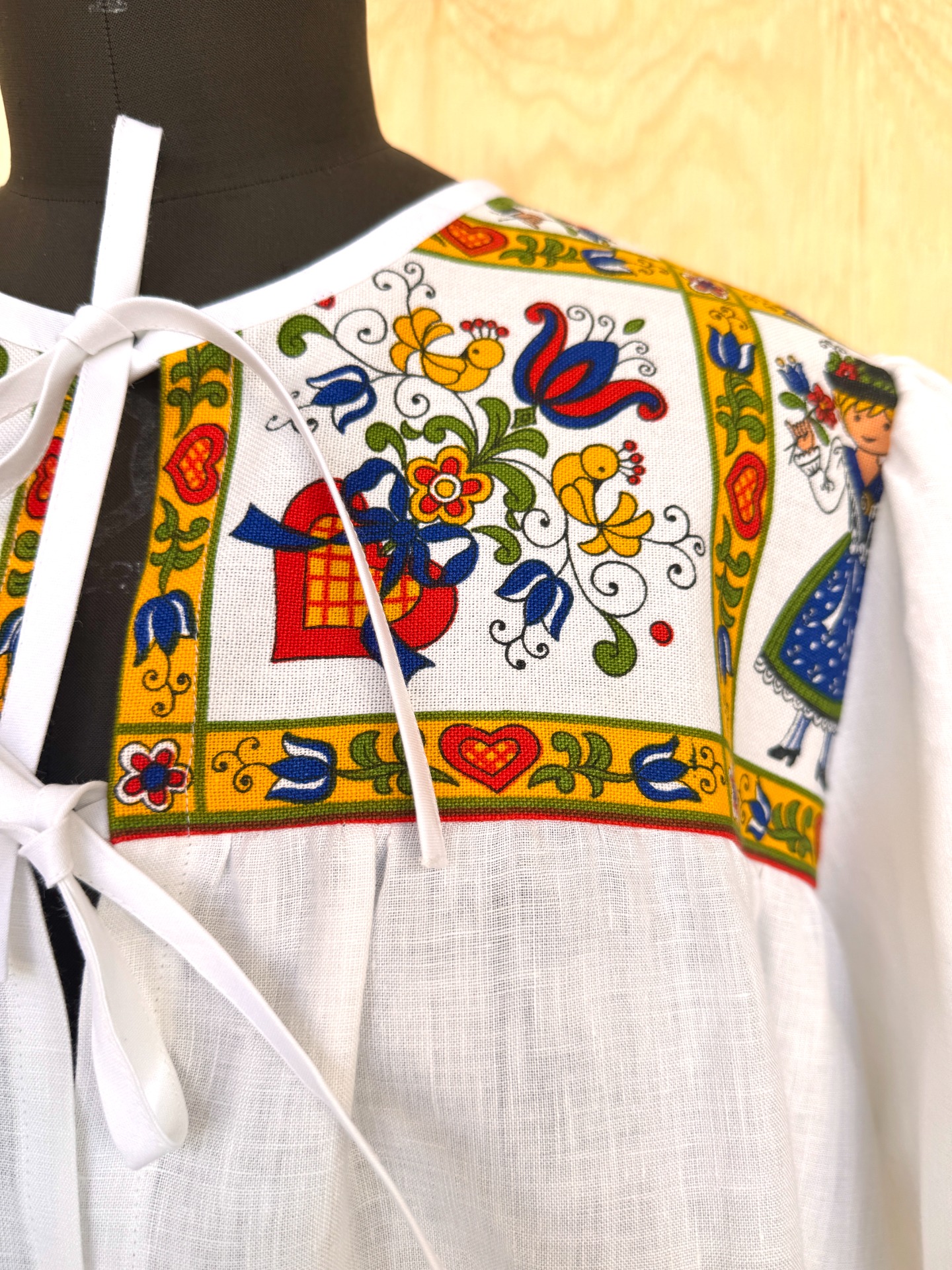 Väljä Alppikukka pusero on valmistettu pellavaisesta käyttämättömästä keittiöpyyheliinasta sekä ylijäämä pellavakankaasta. Leikkaus rinnan yläpuolella. Väljä, rypytetty helma. Vajaamittainen leveä hiha. Hihan pituus 48 cm. Edessä nauhakiinnitys.