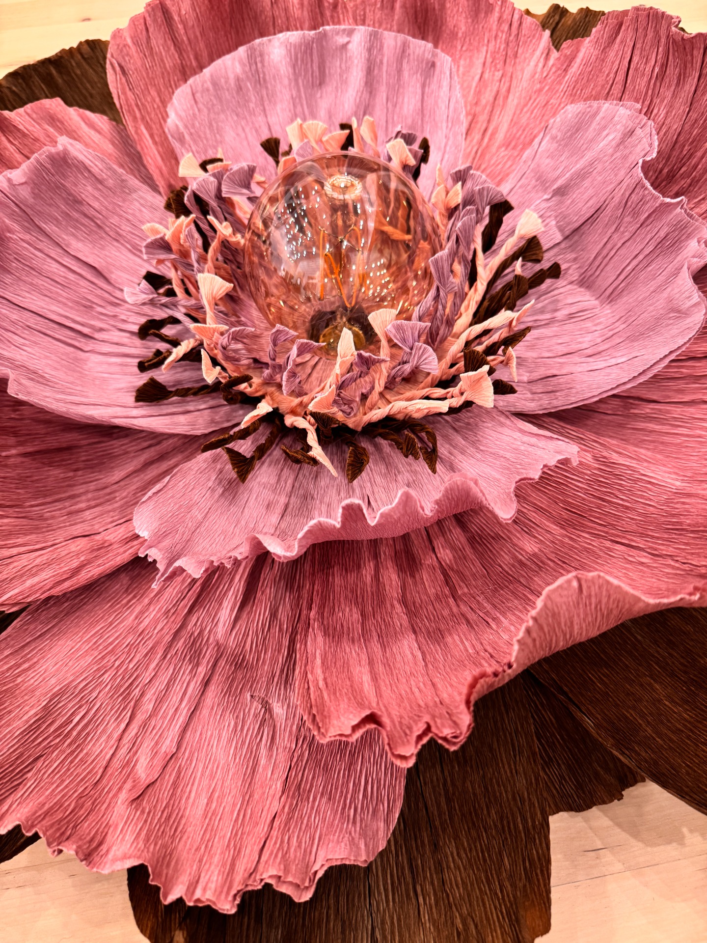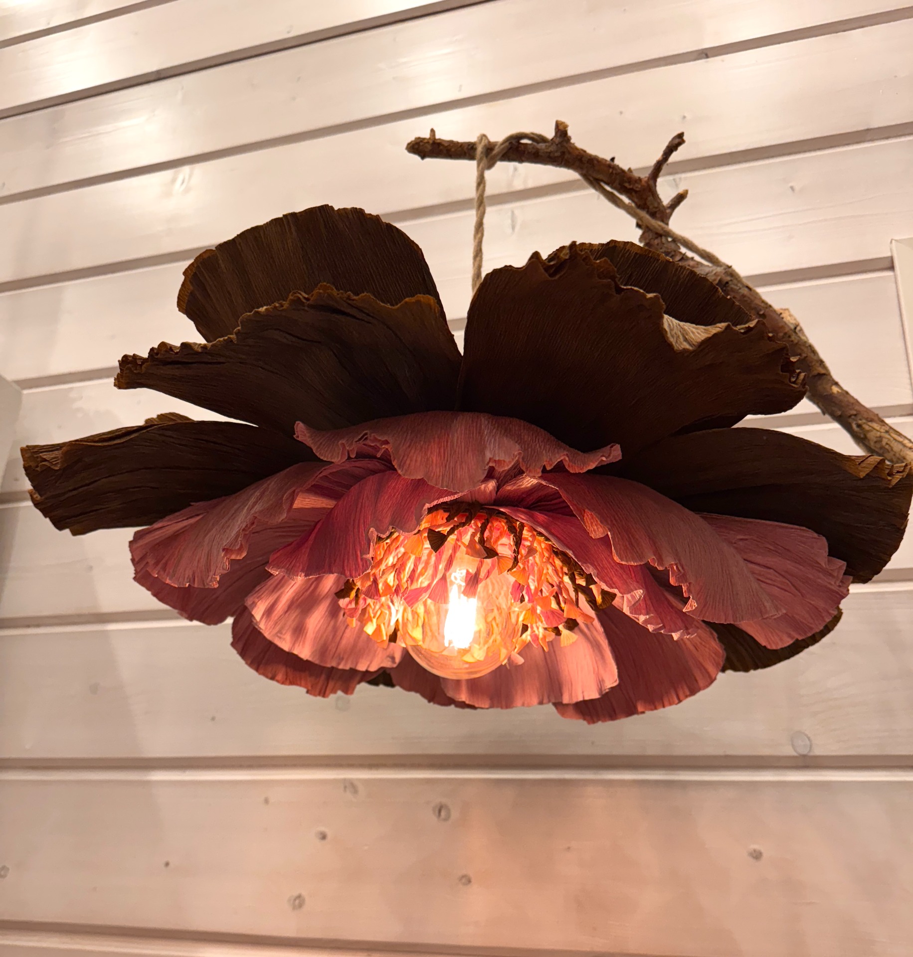"Ruskea Pioni" kukkavalaisin on valmistettu käsin kaksinkertaisesta kreppipaperista. Terälehtien välissä on pieni rautalanka, joka mahdollistaa terälehtien varovaisen taivuttamisen. Voit käyttää sitä kattovalaisimena tai ripustaa sen seinälle. Huomioithan että käytät ainoastaan kuumentumatonta LED polttimoa. Johto ja polttimo eivät sisälly tuotteeseen.